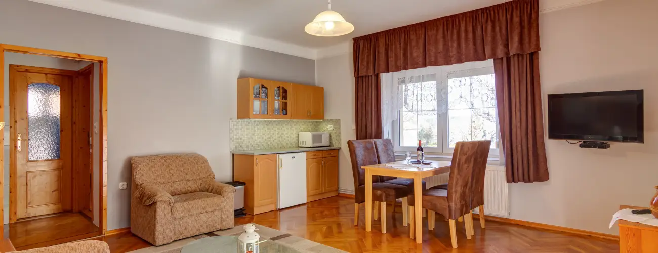 Egész éven át jól felszerelt, külön bejáratú apartmanokkal állnak a vendégek rendelkezésére. A földszinti apartman 2 fő részére egy szobával, és az első emeleti apartman egy illetve kettő szobával: 2-3-4 személynek biztosítanak szálláslehetőséget. Az apartmanház kizárólag nemdohányzó apartmanokkal rendelkezik. Az erkélyeken kerti bútorok, napernyő lehetőség áll rendelkezésre.
